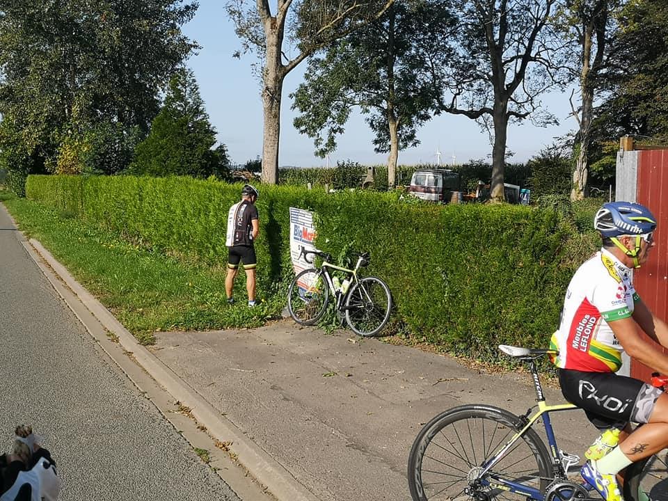 pierre et freddy prennent donc la tête du peloton et nous emmènent vers isbergues .Nathalie en progrés se positionne dans les premières places du peloton. Direction ensuite rombly la première bosse du parcours puis estrée blanche.C'est ensuite la pause ravito avant auchy au bois ou plutôt la pause pipi pour guillaume (voir photos) qui a revêtu son beau maillot de la cyclo la bisou disputée il y a 8 jours .